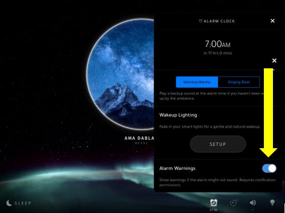 Scroll to the bottom of the ‘Alarm Clock’ settings panel that pops up and you’ll find the ‘Alarm Warnings’ feature. If you slide the toggle to the right and the background of the toggle is highlighted blue, you will have successfully activated the warning feature.