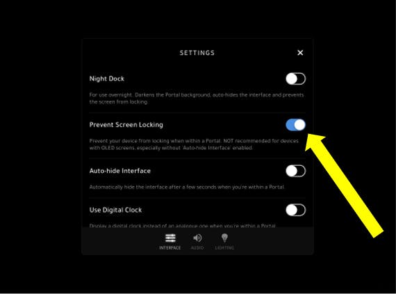 Tap ‘Settings’ and use the slider to activate the "Prevent Screen Locking" feature. This will prevent your device from locking when you are within a portal. You’ll know when is activated when the slider background is highlighted in blue.
